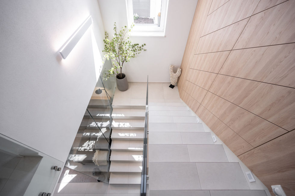 Kompletní realizace interiéru nového rodinného domu v jihočeském Písku. Kombinace dřeva se sklem vyplnila prostor paletou teplých tónů, přirozeným světlem, opticky prostor provzdušnila a oddělila od schodiště, elegantního solitéru propojujícího přízemí s prvním podlažím.